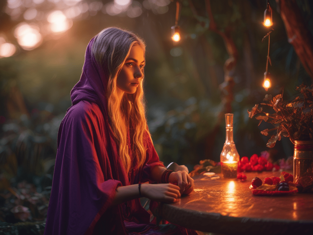 Sie hatte dir ein Glas mitgebracht. Sanft sprudelte eine violette Mischung darin und der Duft des Gebräus ließ sofort traumtänzerische Bilder in deinem Kopf emporsteigen. Du nimmst an. Sie war wirklich hübsch! Das strähnige, blonde Haar fiel frech unter einer roten Kapuze hervor. Aufgeweckt und neugierig blitzten dich die stahlblauen Augen an. Das aufrichtige Lächeln zeigte makellos weiße Zähne und um den Mund herum vergruben sich spielerisch kleinere Lachfalten. Der Trank, den sie dir gereicht hatte, schmeckte bitter und leicht alkoholisch. Schnell wurdet ihr also heiter und ihr begannt euch offener zu unterhalten.